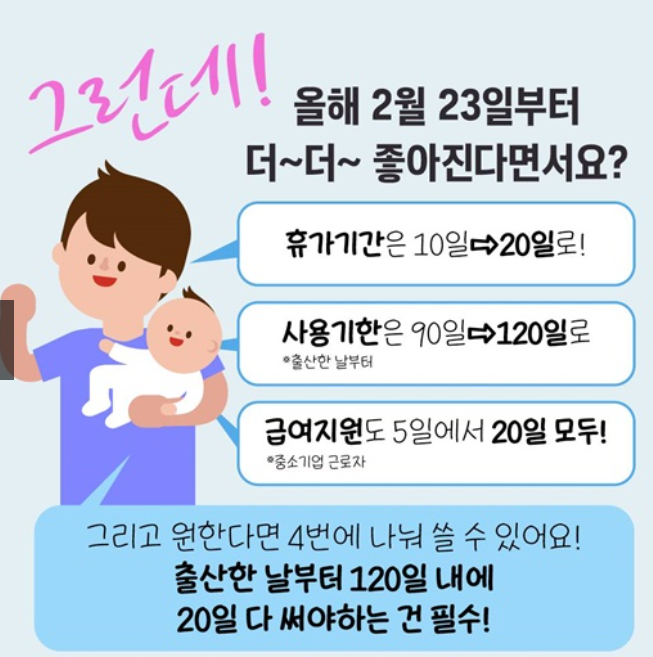 ✅ 분할 사용 적극 활용: 3회까지 분할 사용이 가능하므로, 출산 직후, 산후조리 후, 신생아 돌봄 시기에 맞춰 유연하게 활용하세요.
