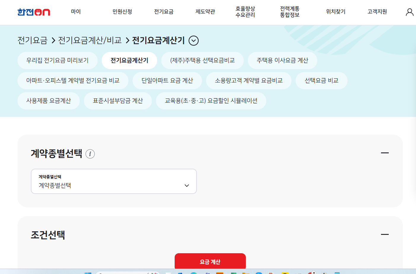 - '전기요금 계산/비교' 메뉴 선택