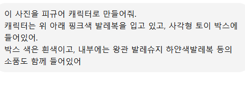 | 우주 컨셉 | “사진 속 인물을 우주복 입은 피규어로 만들어줘. 흰색 박스 안에 우주 관련 소품들과 함께 배치하고, 박스 상단엔 ㅇ ㅇ 라고 적어줘.” |