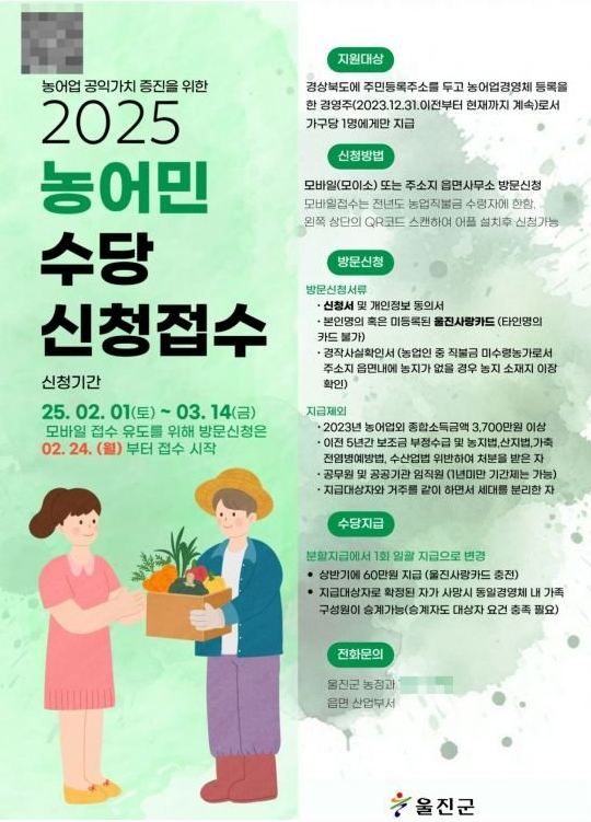 | 경상북도 | 2025년 2월 1일 ~ 3월 14일 | 주민센터 방문 또는 온라인 신청(‘모이소’ 앱) | 농가당 연 60만 원 | 경북 도내 1년 이상 거주 + 영농 종사자, 농업경영체 등록 |